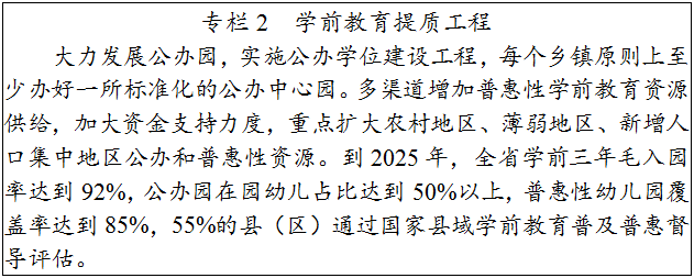 2.供给更加公平。教育基本公共服务均等化水平明显提高,教育结构和资源配置更加优化。学前教育普及普惠迈上新台阶,优质公办园大幅增加;义务教育优质均衡发展和城乡一体化有效推进,城乡、区域差距不断缩小;高质量普及高中阶段教育,实现多样化有特色发展;高等教育普及水平稳步提高,新增劳动力受过高等教育比例进一步提高;特殊教育、专门教育保障体系进一步完善,民族教育实现特色而有质量的发展。