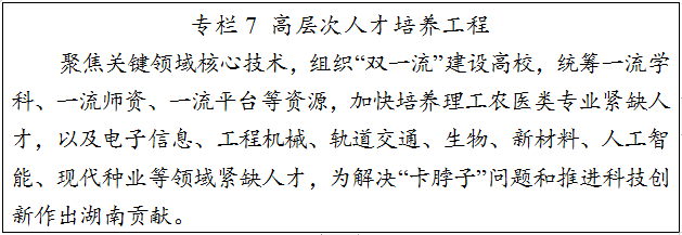 1.加快“双一流”建设。主动服务国家重大需求和我省“三高四新”战略,落实教育部和省政府重点共建湖南“双一流”建设高等学校协议,引导和支持高校围绕学校特色、学科优势,凝练学科方向,打造学科高峰,建优建强一流大学创新体系,着力培育世界一流和国内一流学校与学科。深化基础学科、扶持冷门学科、强化应用学科、发展交叉学科,支持中医药教育,建设一批服务我省支柱产业、优势产业和战略新兴产业的一流学科和紧缺专业,加快培养理工农医和师范、家政、养老服务类专业紧缺人才。完善高校“双一流”建设动态调整机制,建立和完善高校分类发展及评价体系,引导高校和学科争创一流。