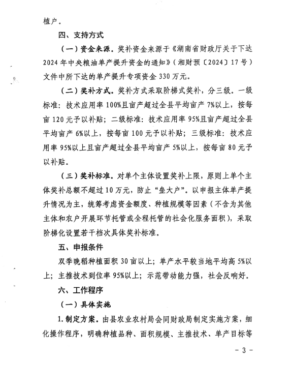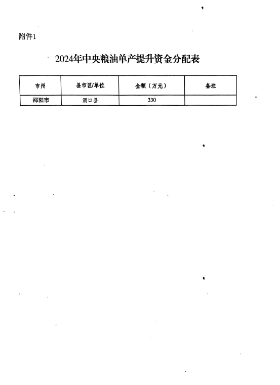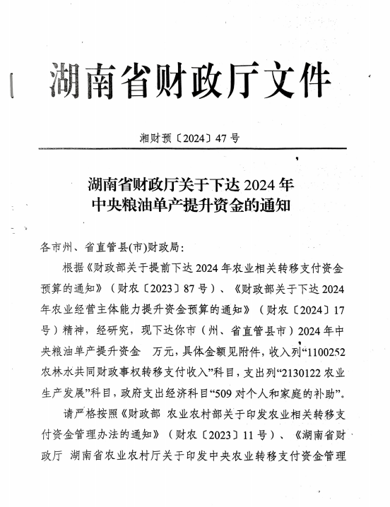 湖南省财政厅关于下达2024年中央粮油单产提升资金的通知